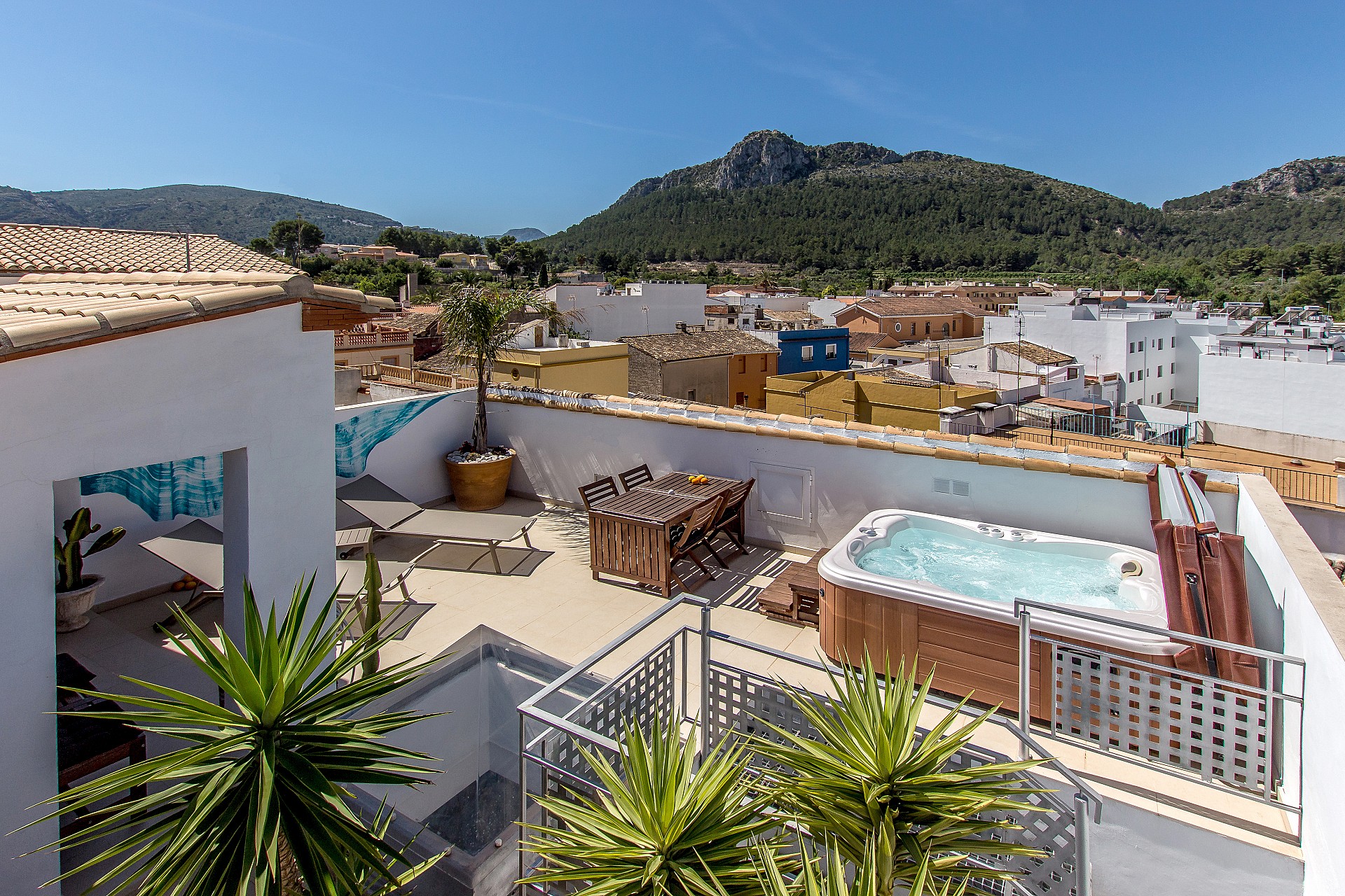 En la azotea del hotel se encuentra uno de sus rincones más especiales: un jacuzzi de uso privado con vistas al casco antiguo de Orba (Alicante) y a las montañas de la Marina Alta.